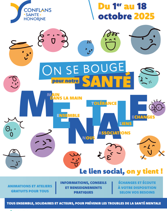 Ci-dessous le flyer concernant les actions de la ville de Conflans-Sainte-Honorine autour de la santé mentale. Du 1er au 18 octobre 2025, animations et ateliers gratuits pour tous.