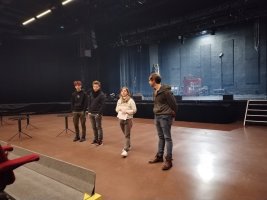 Quelques mots de vocabulaire propres au théâtre ont d’abord été expliqués aux élèves ainsi que quelques superstitions. Puis, on nous a expliqué ce que cela signifiait de faire venir un spectacle et quelles étaient les contraintes, les impacts... De nombreux corps de métiers sont susceptibles d’intervenir. L’équipe du théâtre proprement dite compte 5 personnes, mais très souvent, lors de la venue de spectacles, des intermittents interviennent ou les professionnels aves lesquels les artistes ont l’habitude de travailler. Dans ce cas, les régisseurs sont là pour accompagner, car c’est eux qui connaissent le mieux la salle. En réalité, le montant réglé par le spectateur ne suffit pas à payer le spectacle. Il y a beaucoup de frais annexes : électricité, hôtels... Les amplitudes de travail pour les métiers du spectacle peuvent être importantes par périodes. Ce sont des métiers de passion.